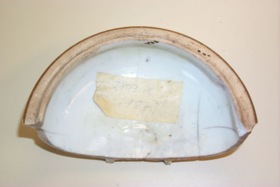 Lock till burk. Välvt med skålformat "handtag" i mitten på ovansidan, oglaserad kant, på undersidan, för passning i burken. Kategori K; Vitt med emaljfärgsdekor och ränder i underglasyrblått. Emaljfärgsdekoren är mestadels bortfallen, den som finns kvar är rosa och grön.