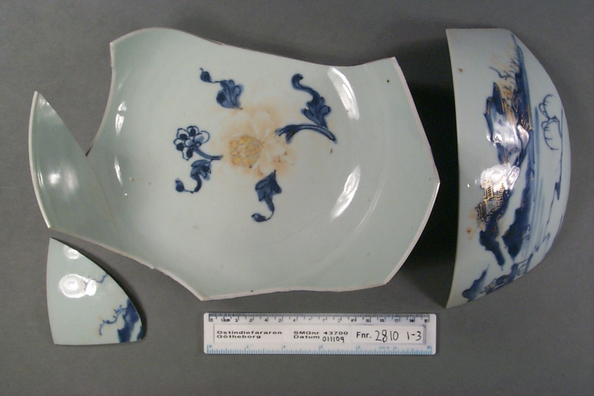Kategori B: underglasyrblå dekor och emaljfärger på glasyren, s.k. Kinesiskt Imariporslin. Skålen är sönderslagen i fyra delar, en är monterad, de andra har varit monterade. Rester av bindemedel på andra brottytor kan peka på tidigare sammanfogning med andra delar som nu saknas.