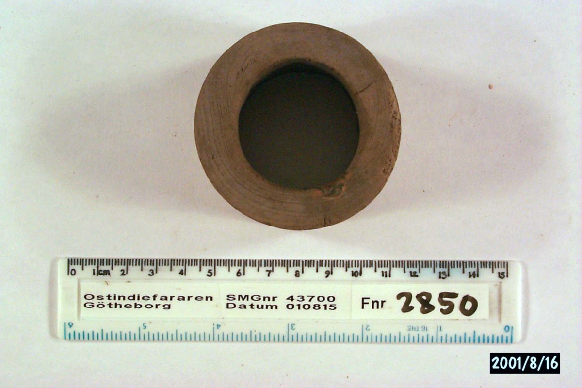 Föremålet är från vraket av ostindiefararen Götheborg, som gjorde tre resor till Kina 1739-45. Vid hemkomsten från den sista resan 12 september 1745 förliste fartyget vid grundet Hunnebådan strax utanför Nya Elfsborgs fästning. Vid flera tillfällen har material tagits upp från vraket. Föremålet kommer från de marinarkeologiska utgrävningarna på platsen 1986-1992.