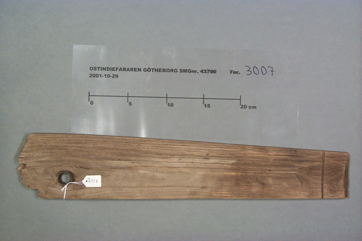 Föremålet är från vraket av ostindiefararen Götheborg, som gjorde tre resor till Kina 1739-45. Vid hemkomsten från den sista resan 12 september 1745 förliste fartyget vid grundet Hunnebådan strax utanför Nya Elfsborgs fästning. Vid flera tillfällen har material tagits upp från vraket. Föremålet kommer från de marinarkeologiska utgrävningarna på platsen 1986-1992.