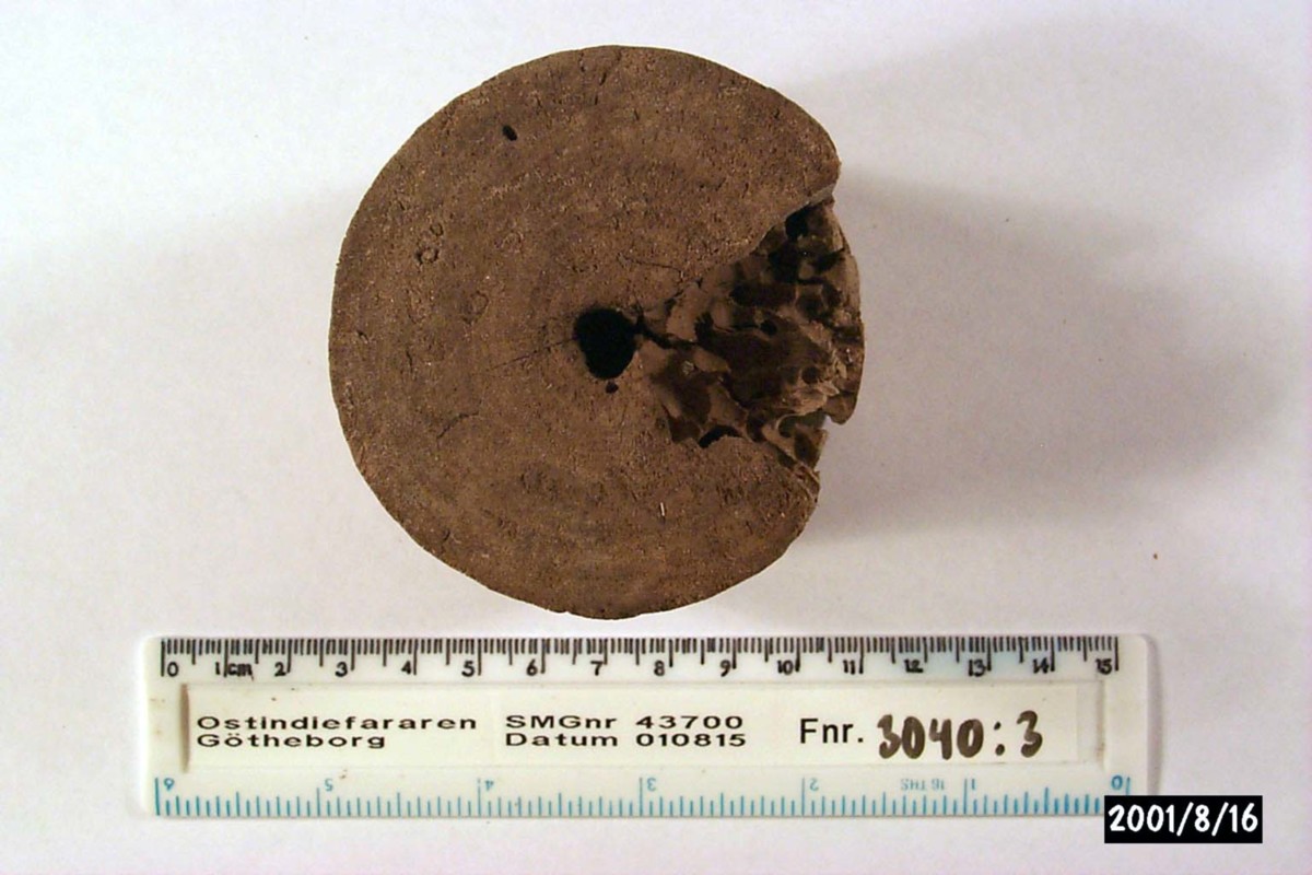 Föremålet är från vraket av ostindiefararen Götheborg, som gjorde tre resor till Kina 1739-45. Vid hemkomsten från den sista resan 12 september 1745 förliste fartyget vid grundet Hunnebådan strax utanför Nya Elfsborgs fästning. Vid flera tillfällen har material tagits upp från vraket. Föremålet kommer från de marinarkeologiska utgrävningarna på platsen 1986-1992.