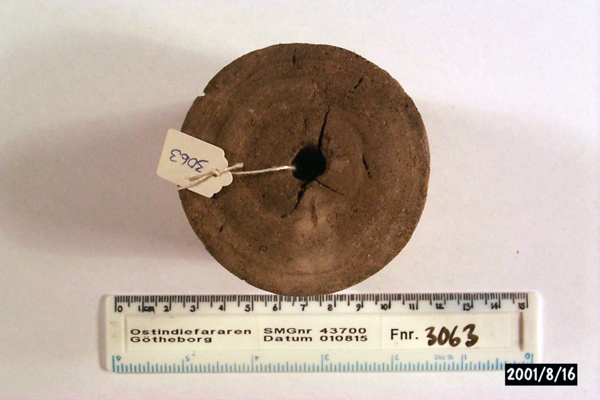 Föremålet är från vraket av ostindiefararen Götheborg, som gjorde tre resor till Kina 1739-45. Vid hemkomsten från den sista resan 12 september 1745 förliste fartyget vid grundet Hunnebådan strax utanför Nya Elfsborgs fästning. Vid flera tillfällen har material tagits upp från vraket. Föremålet kommer från de marinarkeologiska utgrävningarna på platsen 1986-1992.