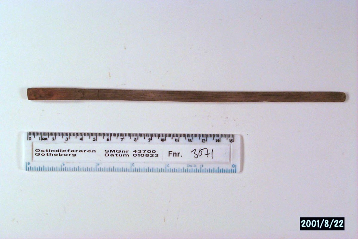 Föremålet är från vraket av ostindiefararen Götheborg, som gjorde tre resor till Kina 1739-45. Vid hemkomsten från den sista resan 12 september 1745 förliste fartyget vid grundet Hunnebådan strax utanför Nya Elfsborgs fästning. Vid flera tillfällen har material tagits upp från vraket. Föremålet kommer från de marinarkeologiska utgrävningarna på platsen 1986-1992.