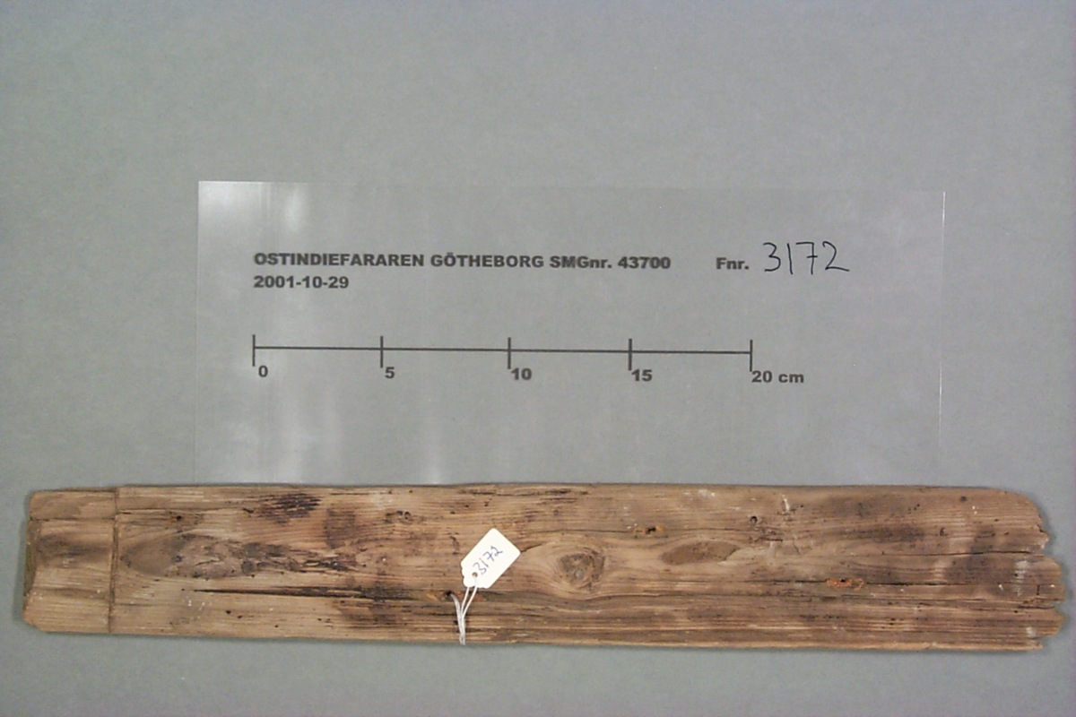 Föremålet är från vraket av ostindiefararen Götheborg, som gjorde tre resor till Kina 1739-45. Vid hemkomsten från den sista resan 12 september 1745 förliste fartyget vid grundet Hunnebådan strax utanför Nya Elfsborgs fästning. Vid flera tillfällen har material tagits upp från vraket. Föremålet kommer från de marinarkeologiska utgrävningarna på platsen 1986-1992.