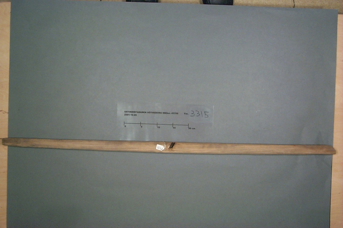 Föremålet är från vraket av ostindiefararen Götheborg, som gjorde tre resor till Kina 1739-45. Vid hemkomsten från den sista resan 12 september 1745 förliste fartyget vid grundet Hunnebådan strax utanför Nya Elfsborgs fästning. Vid flera tillfällen har material tagits upp från vraket. Föremålet kommer från de marinarkeologiska utgrävningarna på platsen 1986-1992.