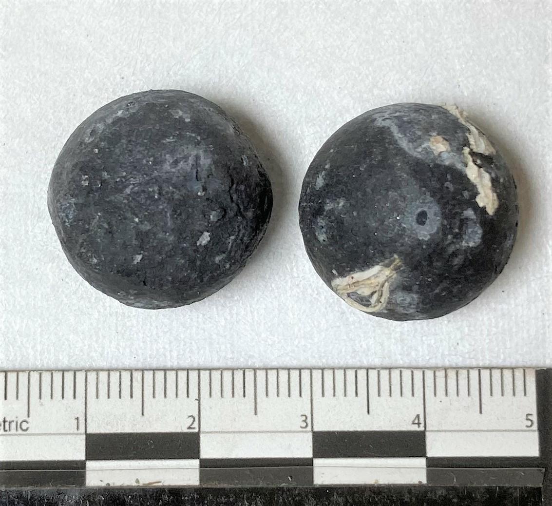 Två kulor, korroderade, kalkbeläggningar i partier på den ena kulan.