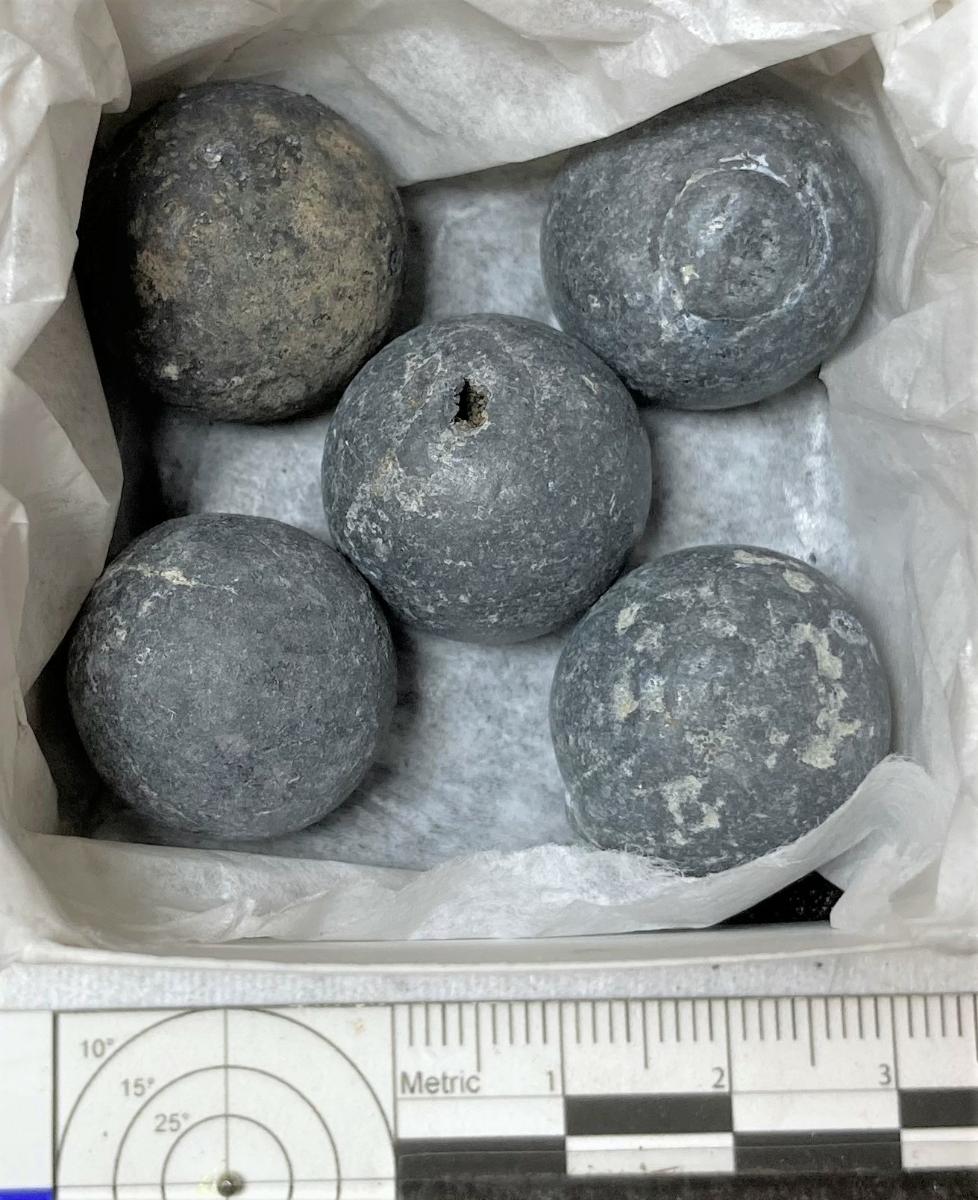 Muskötkulor, fem stycken. Fyra mycket gott skic, en korroderad, lätt skrovlig.
