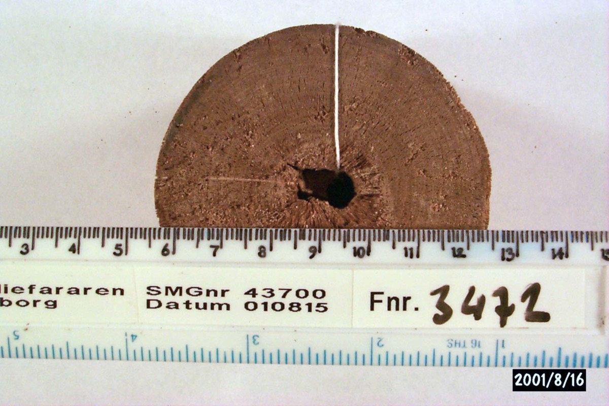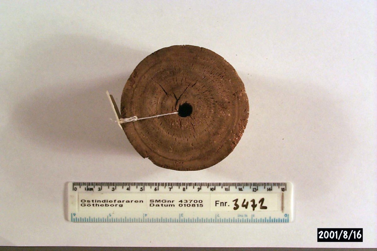 Föremålet är från vraket av ostindiefararen Götheborg, som gjorde tre resor till Kina 1739-45. Vid hemkomsten från den sista resan 12 september 1745 förliste fartyget vid grundet Hunnebådan strax utanför Nya Elfsborgs fästning. Vid flera tillfällen har material tagits upp från vraket. Föremålet kommer från de marinarkeologiska utgrävningarna på platsen 1986-1992.