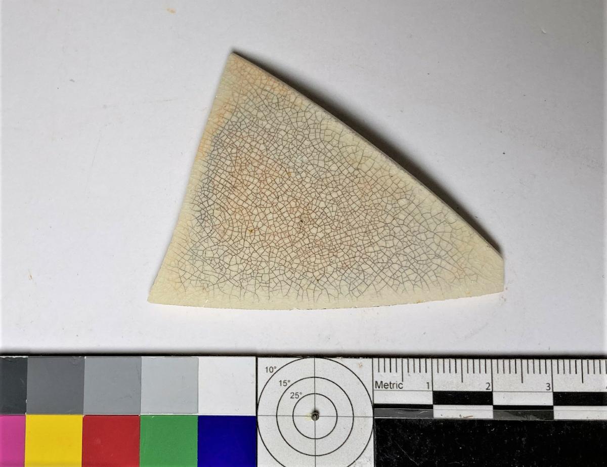Triangulär skärva av kärl, kantdel. Ljust gods med vit krackelerad glasyr. Recent?