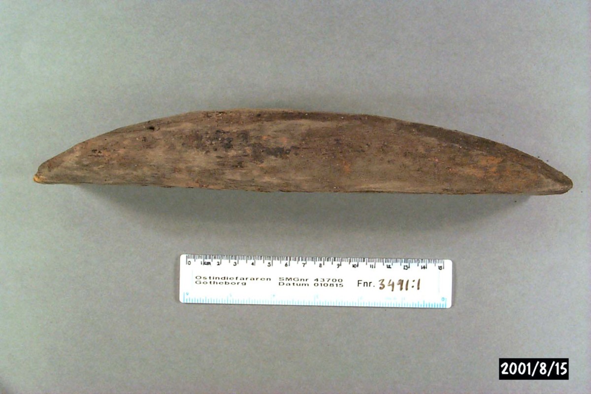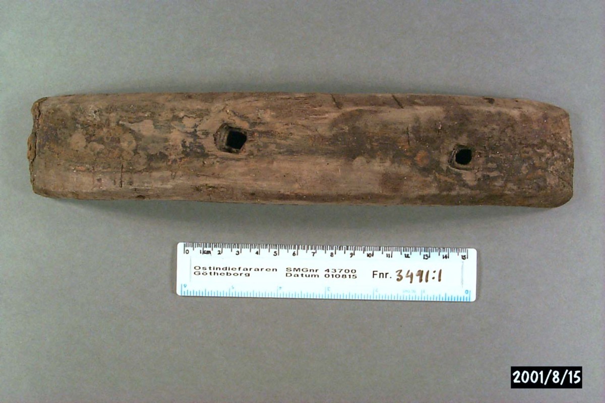 Föremålet är från vraket av ostindiefararen Götheborg, som gjorde tre resor till Kina 1739-45. Vid hemkomsten från den sista resan 12 september 1745 förliste fartyget vid grundet Hunnebådan strax utanför Nya Elfsborgs fästning. Vid flera tillfällen har material tagits upp från vraket. Föremålet kommer från de marinarkeologiska utgrävningarna på platsen 1986-1992.