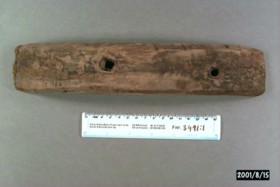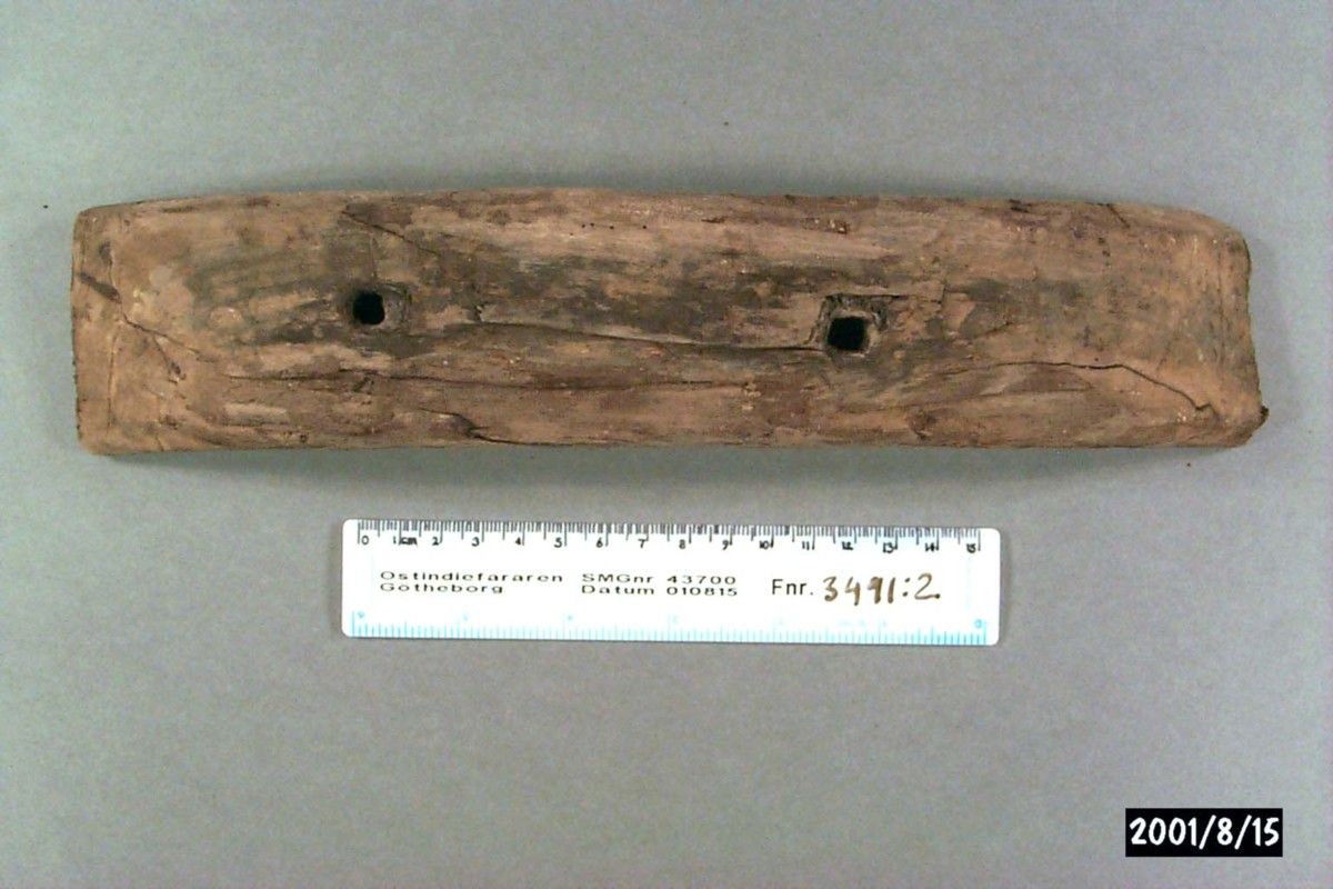 2) l: 285m, b: 55, h: 35 mm. Två genomgående hål 7x7 mm, spår efter spik med fyrkantig skalle.