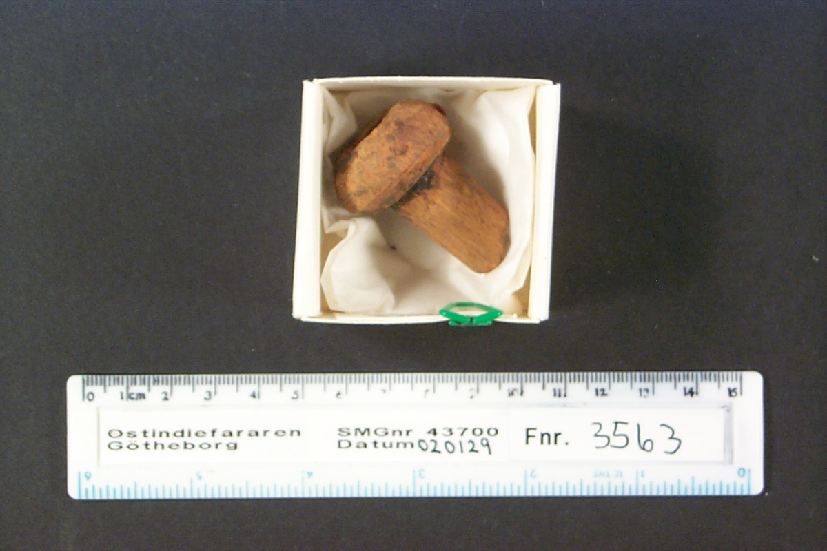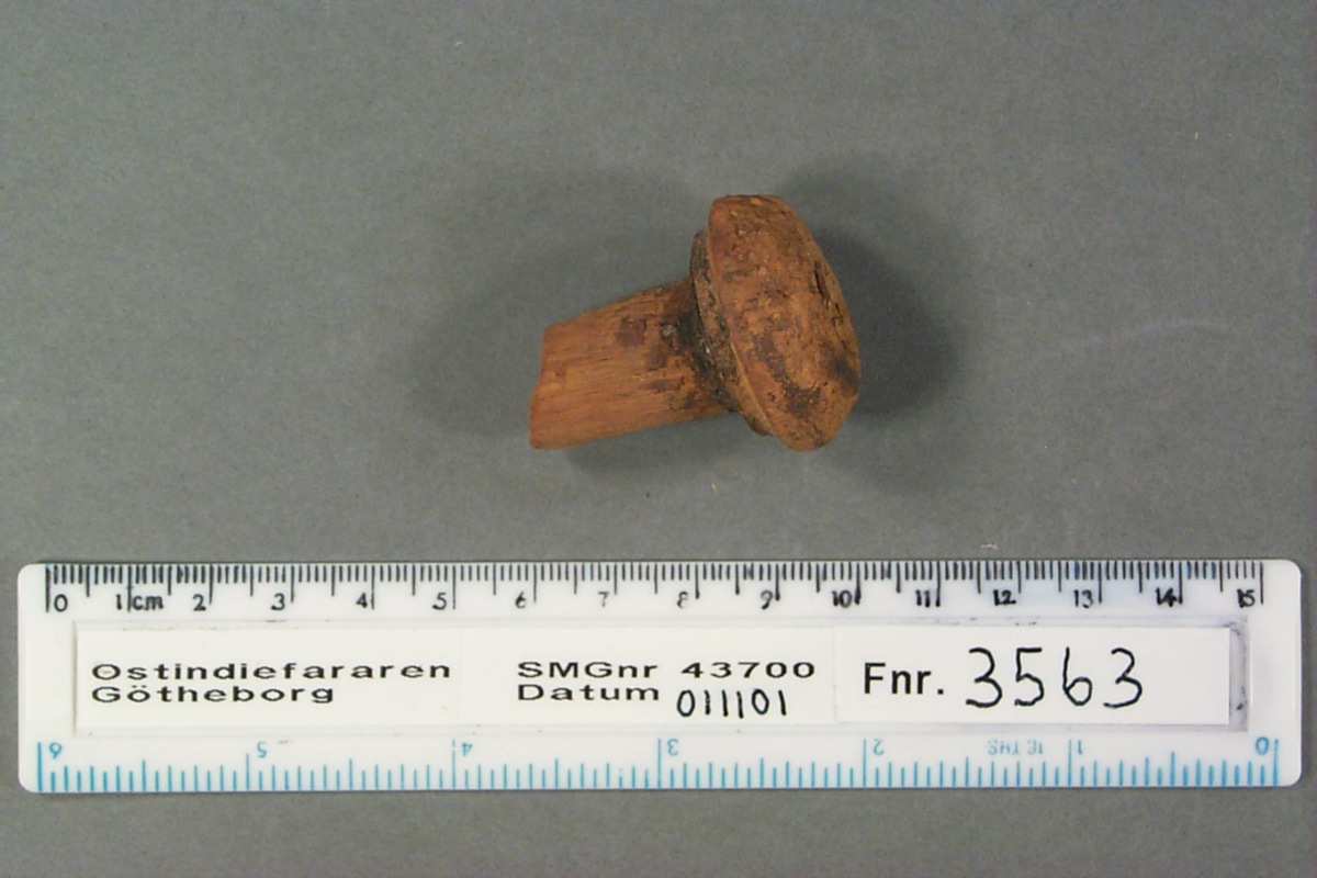 Föremålet är från vraket av ostindiefararen Götheborg, som gjorde tre resor till Kina 1739-45. Vid hemkomsten från den sista resan 12 september 1745 förliste fartyget vid grundet Hunnebådan strax utanför Nya Elfsborgs fästning. Vid flera tillfällen har material tagits upp från vraket. Föremålet kommer från de marinarkeologiska utgrävningarna på platsen 1986-1992.