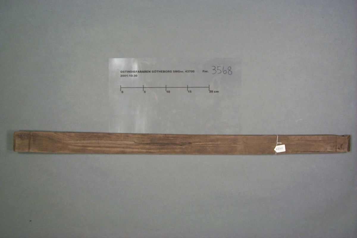 Föremålet är från vraket av ostindiefararen Götheborg, som gjorde tre resor till Kina 1739-45. Vid hemkomsten från den sista resan 12 september 1745 förliste fartyget vid grundet Hunnebådan strax utanför Nya Elfsborgs fästning. Vid flera tillfällen har material tagits upp från vraket. Föremålet kommer från de marinarkeologiska utgrävningarna på platsen 1986-1992.