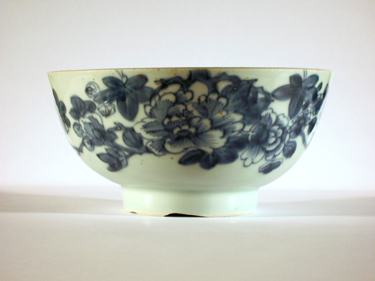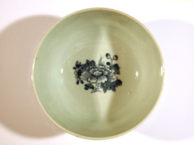 Kategori A: Underglasyrblå dekor. Motiv: blomma i mitten på botten på insidan, blommor och blad på utsidan.