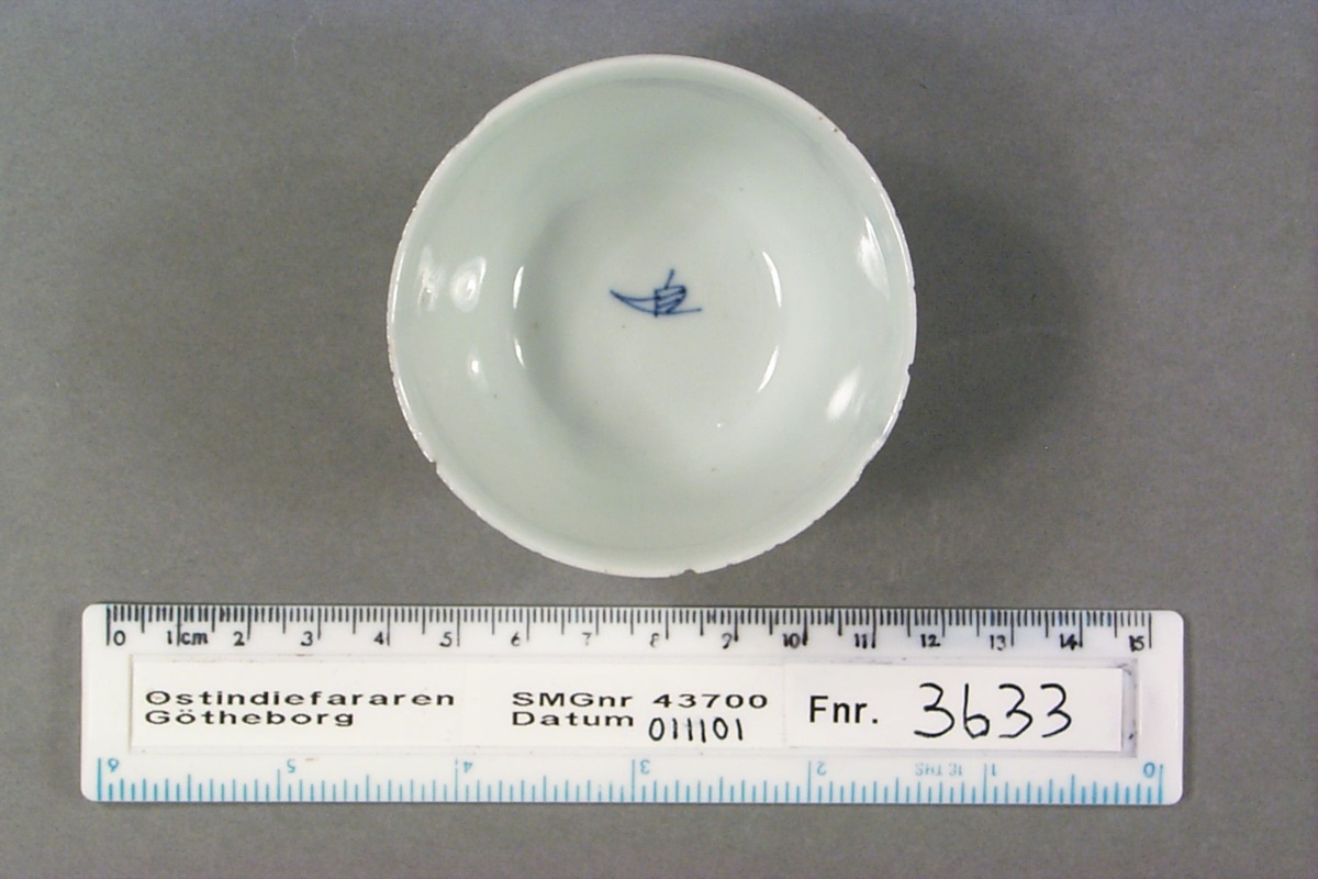 Kategori A; underglasyrblå dekor. Mycket tunt och fint gods. Flera fina kantavslag i mynningskanten.