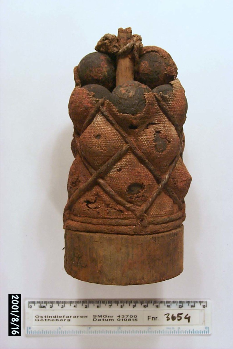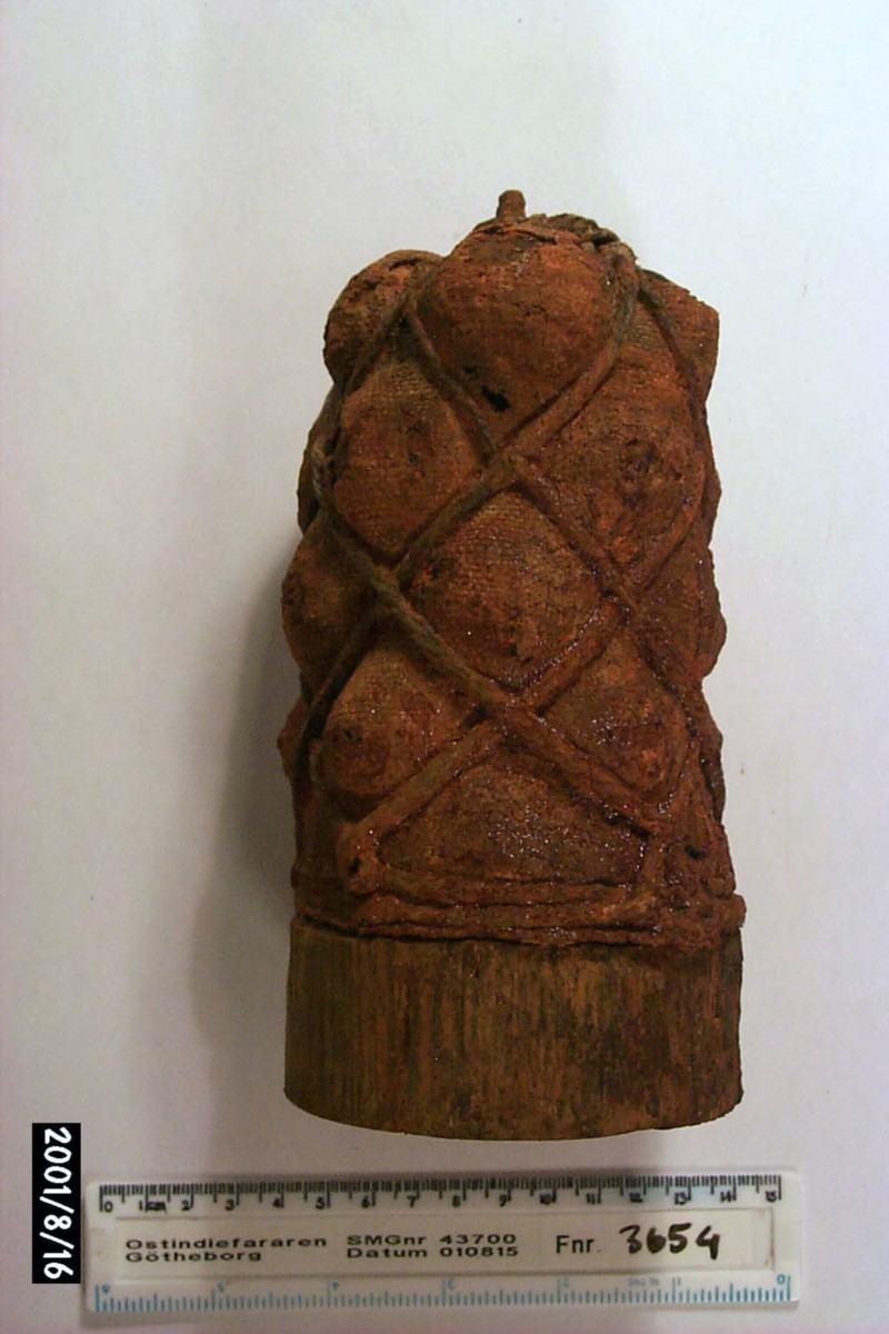 Föremålet är från vraket av ostindiefararen Götheborg, som gjorde tre resor till Kina 1739-45. Vid hemkomsten från den sista resan 12 september 1745 förliste fartyget vid grundet Hunnebådan strax utanför Nya Elfsborgs fästning. Vid flera tillfällen har material tagits upp från vraket. Föremålet kommer från de marinarkeologiska utgrävningarna på platsen 1986-1992.