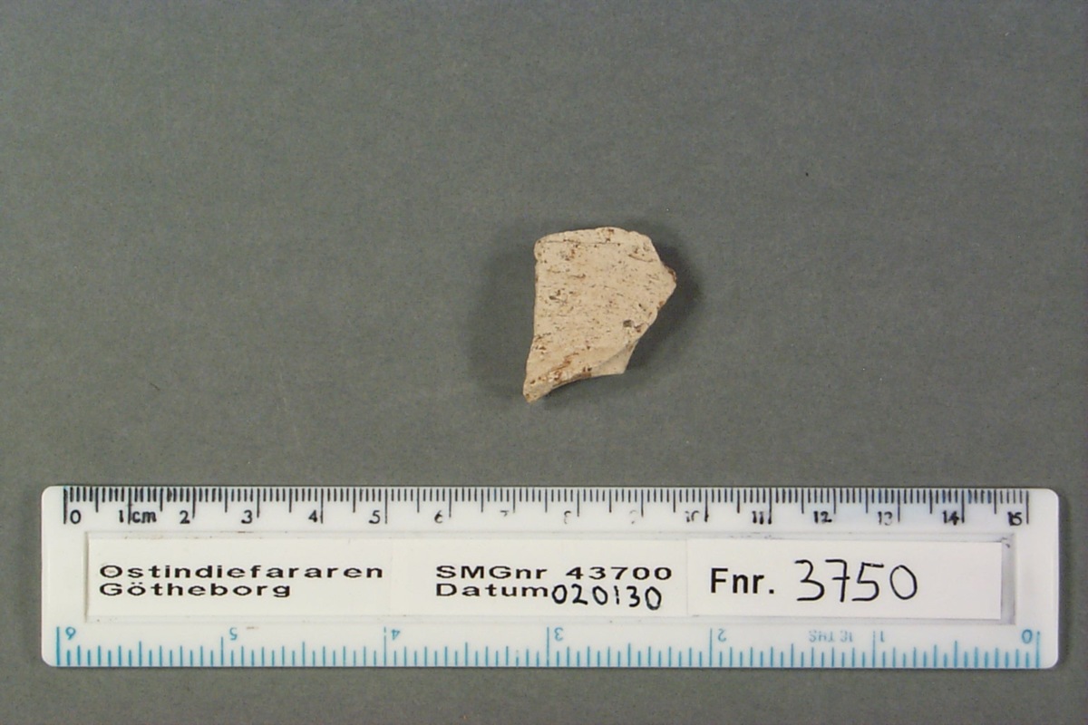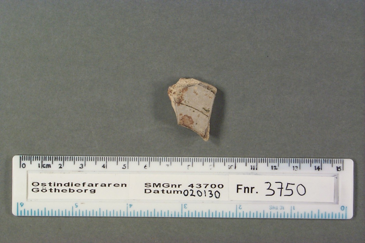 Föremålet är från vraket av ostindiefararen Götheborg, som gjorde tre resor till Kina 1739-45. Vid hemkomsten från den sista resan 12 september 1745 förliste fartyget vid grundet Hunnebådan strax utanför Nya Elfsborgs fästning. Vid flera tillfällen har material tagits upp från vraket. Föremålet kommer från de marinarkeologiska utgrävningarna på platsen 1986-1992.