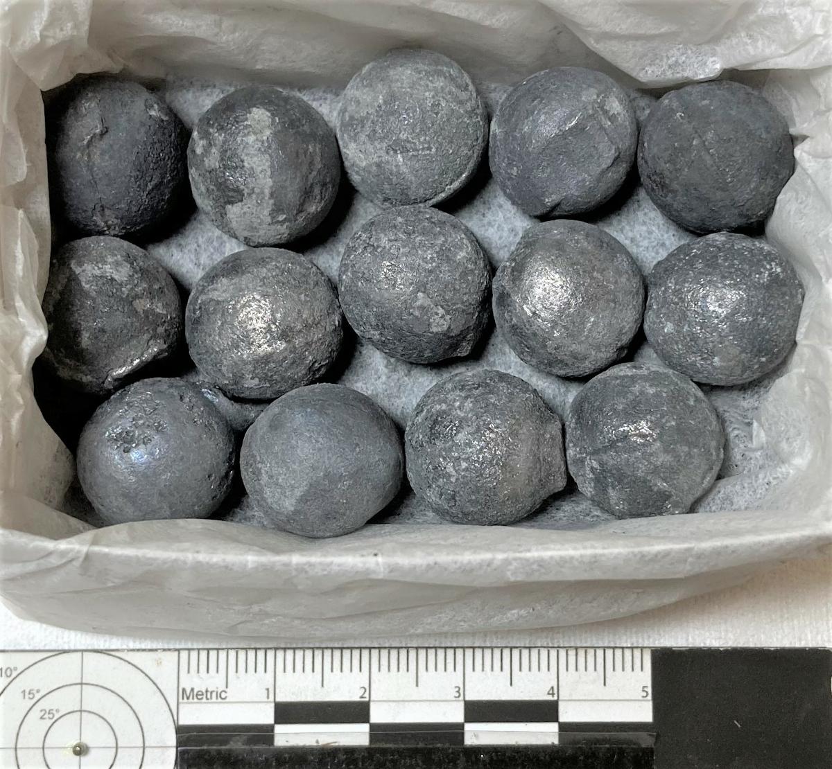 14 mindre muskötkulor, med gjutskägg, gott skick.
