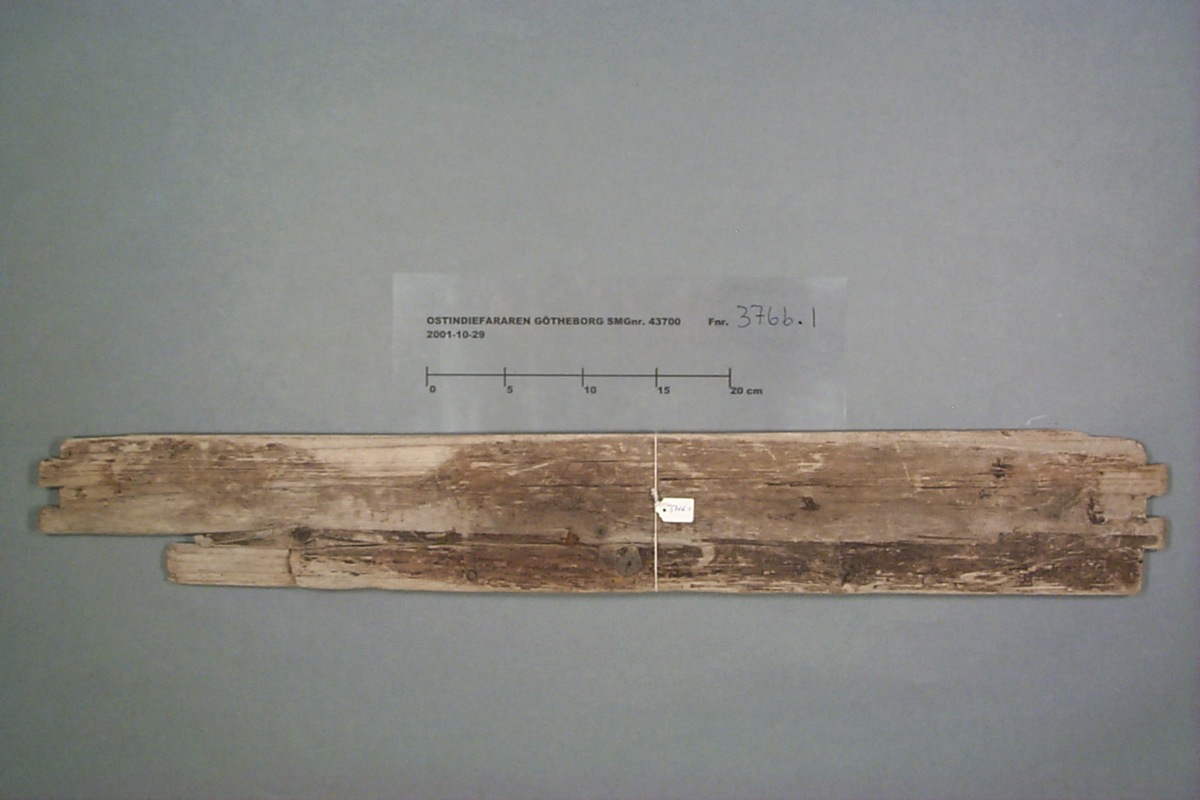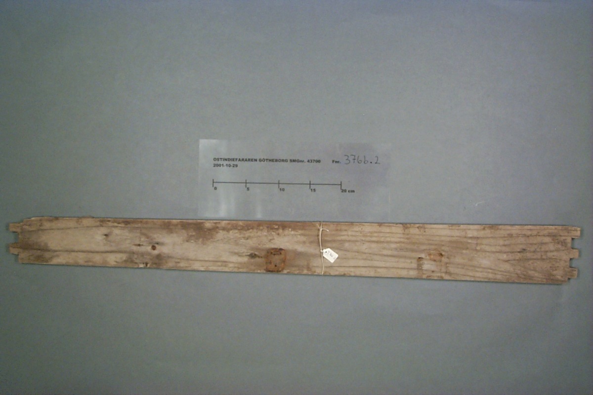 Föremålet är från vraket av ostindiefararen Götheborg, som gjorde tre resor till Kina 1739-45. Vid hemkomsten från den sista resan 12 september 1745 förliste fartyget vid grundet Hunnebådan strax utanför Nya Elfsborgs fästning. Vid flera tillfällen har material tagits upp från vraket. Föremålet kommer från de marinarkeologiska utgrävningarna på platsen 1986-1992.