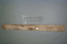 2) l: 885 mm, b: 90 mm, t: 15 mm. Öppen sinkning i båda kortändarna, avbrutna centrumtappar i långsidorna. Spår efter tre stycken beslag utmed ena långsidan; korrosion och tre spik/skruvhål i varje. Rester efter brun färg/ytbehandling på båda sidor.