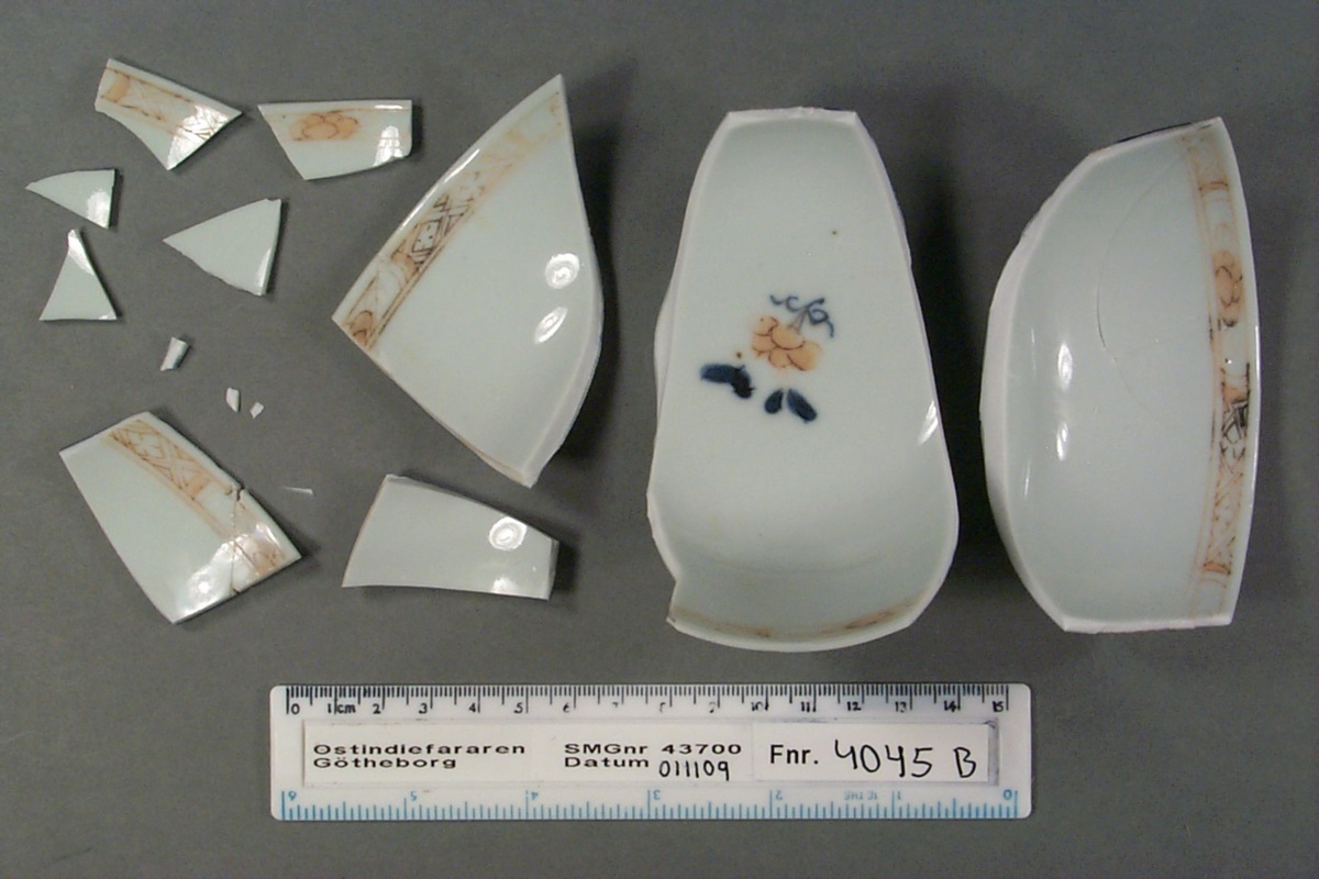 Föremålet är från vraket av ostindiefararen Götheborg, som gjorde tre resor till Kina 1739-45. Vid hemkomsten från den sista resan 12 september 1745 förliste fartyget vid grundet Hunnebådan strax utanför Nya Elfsborgs fästning. Vid flera tillfällen har material tagits upp från vraket. Föremålet kommer från de marinarkeologiska utgrävningarna på platsen 1986-1992.