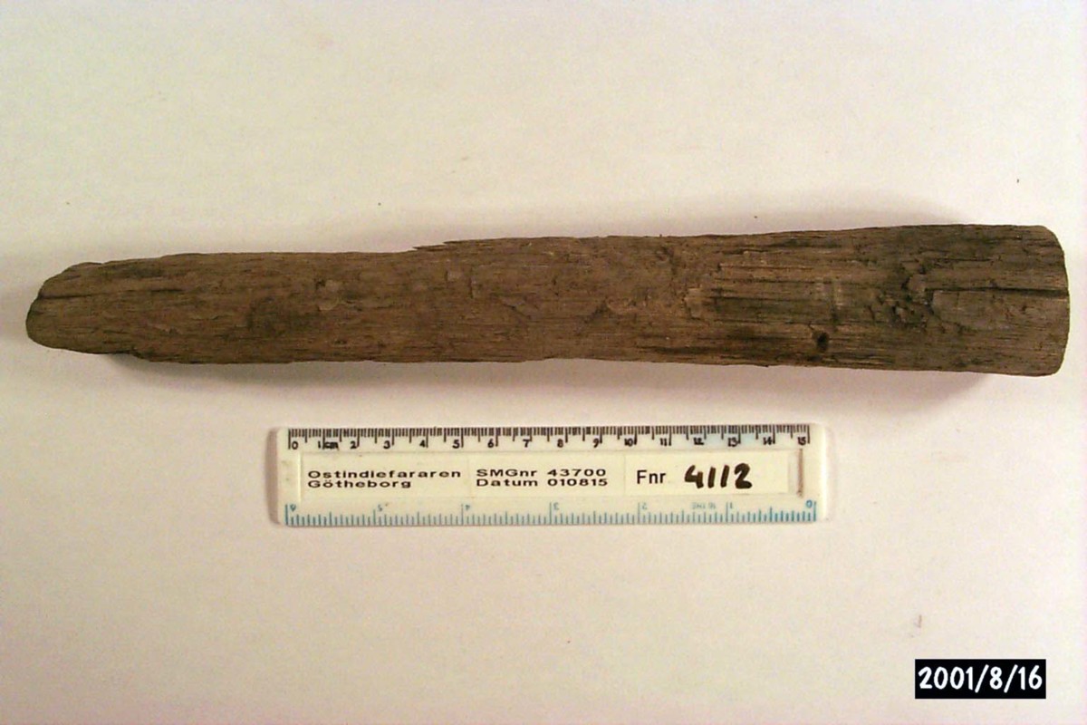 Föremålet är från vraket av ostindiefararen Götheborg, som gjorde tre resor till Kina 1739-45. Vid hemkomsten från den sista resan 12 september 1745 förliste fartyget vid grundet Hunnebådan strax utanför Nya Elfsborgs fästning. Vid flera tillfällen har material tagits upp från vraket. Föremålet kommer från de marinarkeologiska utgrävningarna på platsen 1986-1992.