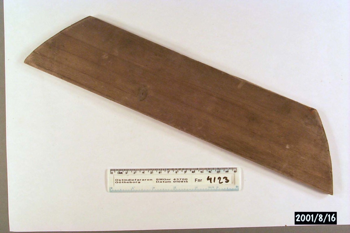 Föremålet är från vraket av ostindiefararen Götheborg, som gjorde tre resor till Kina 1739-45. Vid hemkomsten från den sista resan 12 september 1745 förliste fartyget vid grundet Hunnebådan strax utanför Nya Elfsborgs fästning. Vid flera tillfällen har material tagits upp från vraket. Föremålet kommer från de marinarkeologiska utgrävningarna på platsen 1986-1992.