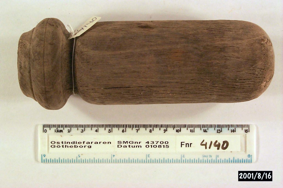 Föremålet är från vraket av ostindiefararen Götheborg, som gjorde tre resor till Kina 1739-45. Vid hemkomsten från den sista resan 12 september 1745 förliste fartyget vid grundet Hunnebådan strax utanför Nya Elfsborgs fästning. Vid flera tillfällen har material tagits upp från vraket. Föremålet kommer från de marinarkeologiska utgrävningarna på platsen 1986-1992.