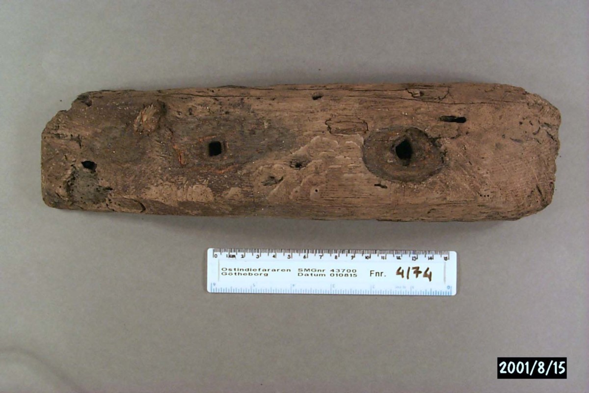 Föremålet är från vraket av ostindiefararen Götheborg, som gjorde tre resor till Kina 1739-45. Vid hemkomsten från den sista resan 12 september 1745 förliste fartyget vid grundet Hunnebådan strax utanför Nya Elfsborgs fästning. Vid flera tillfällen har material tagits upp från vraket. Föremålet kommer från de marinarkeologiska utgrävningarna på platsen 1986-1992.