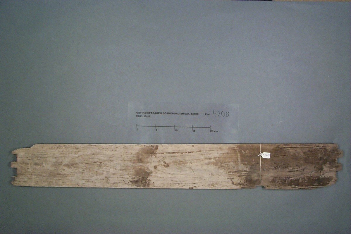 Föremålet är från vraket av ostindiefararen Götheborg, som gjorde tre resor till Kina 1739-45. Vid hemkomsten från den sista resan 12 september 1745 förliste fartyget vid grundet Hunnebådan strax utanför Nya Elfsborgs fästning. Vid flera tillfällen har material tagits upp från vraket. Föremålet kommer från de marinarkeologiska utgrävningarna på platsen 1986-1992.