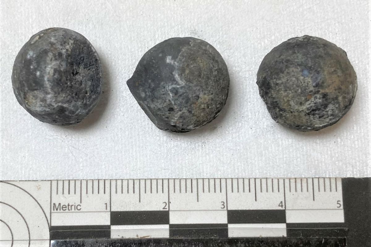 Tre kulor, en tillplattad. Gjutskägg kvar. Lätt korroderade.