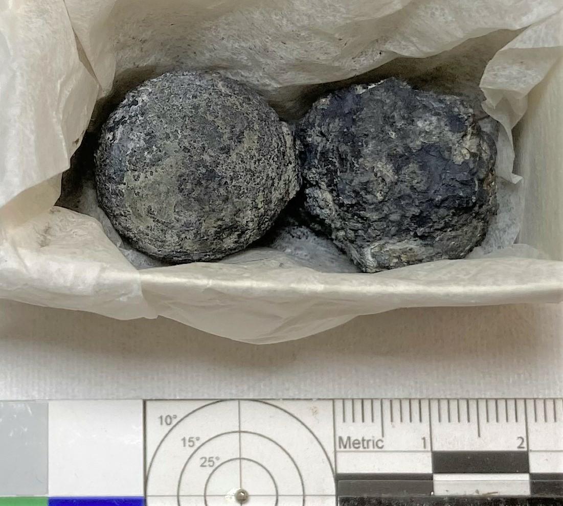 Muskötkulor, 2 st. kraftigt korroderade, skrovliga.