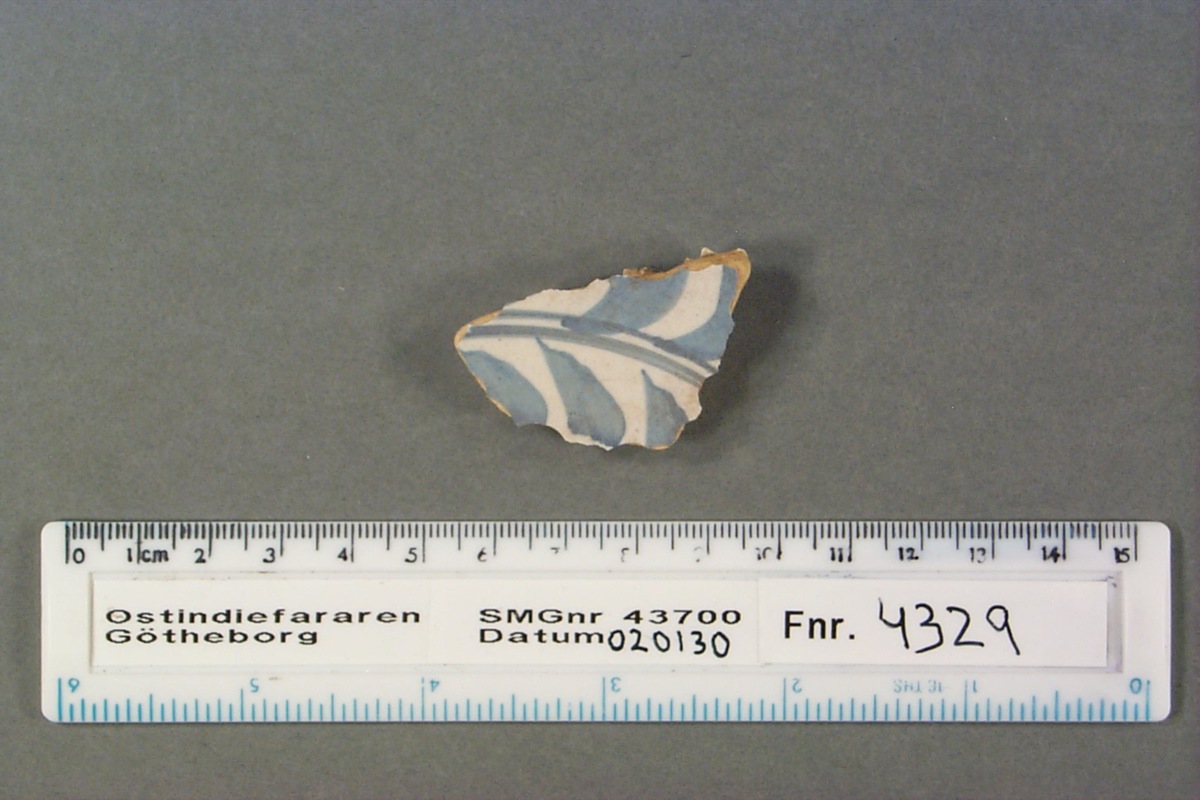 Föremålet är från vraket av ostindiefararen Götheborg, som gjorde tre resor till Kina 1739-45. Vid hemkomsten från den sista resan 12 september 1745 förliste fartyget vid grundet Hunnebådan strax utanför Nya Elfsborgs fästning. Vid flera tillfällen har material tagits upp från vraket. Föremålet kommer från de marinarkeologiska utgrävningarna på platsen 1986-1992.