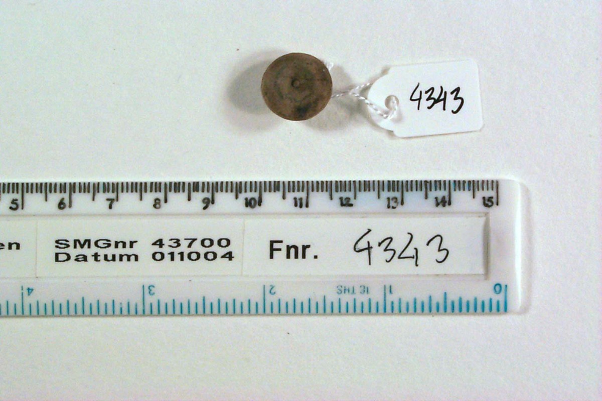 Undersydd knapp; svarvad med låg fot, 4 mm, genomgående hål för tråd/fästning, brätte svagt koniskt med kraterliknande fördjupning med liten knopp i mitten. Dekorrand kring brättets kant.