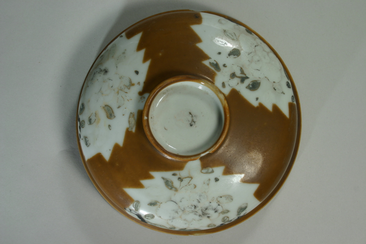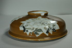 Stort lock, vit glasyr på undersidan, brun glasyr på översidan, tre grupper med överglasyrdekor i form av blommor på översidan, Överglasyrdekor i form av en enkel blomma i mitten av lockets handtag. .