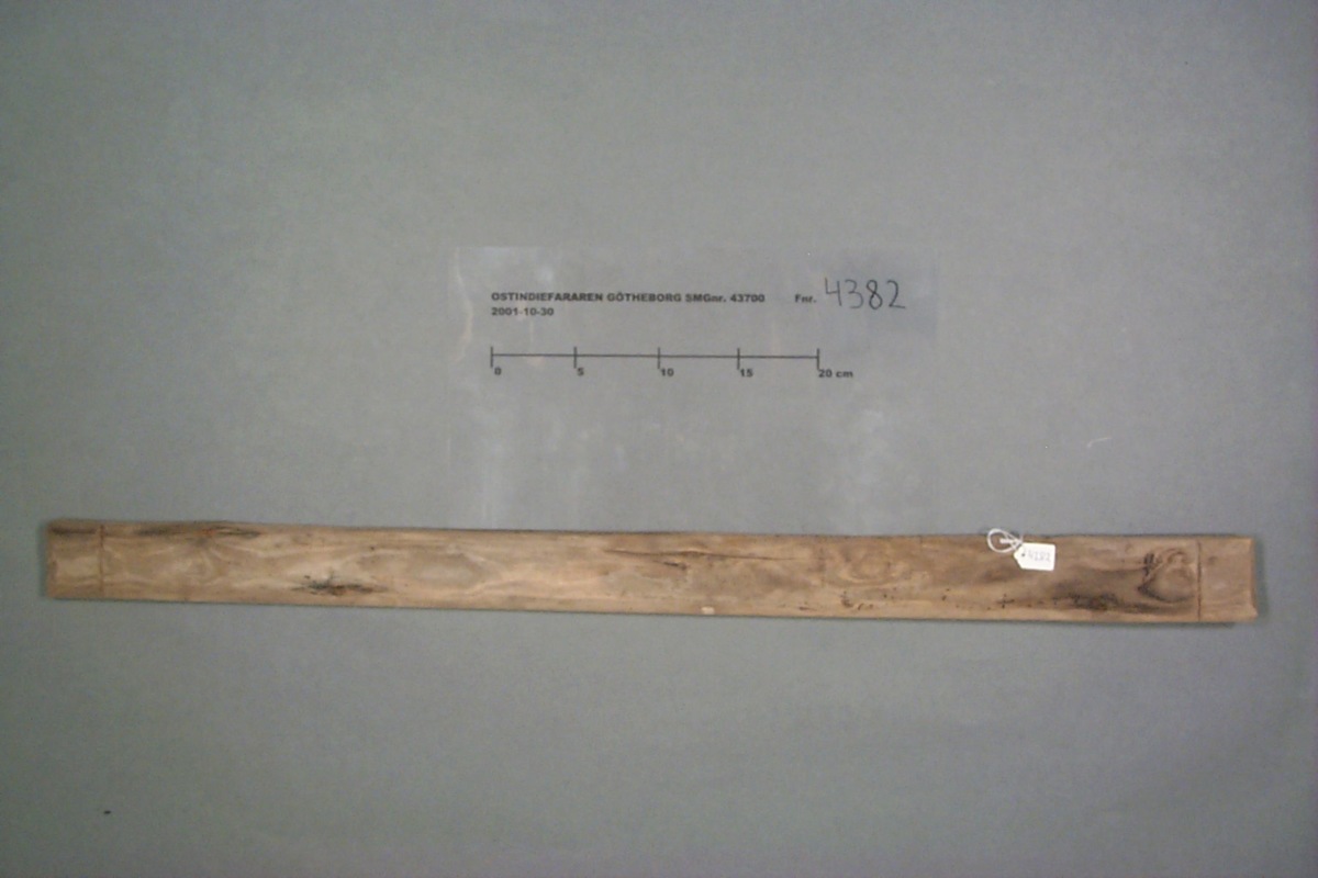 Föremålet är från vraket av ostindiefararen Götheborg, som gjorde tre resor till Kina 1739-45. Vid hemkomsten från den sista resan 12 september 1745 förliste fartyget vid grundet Hunnebådan strax utanför Nya Elfsborgs fästning. Vid flera tillfällen har material tagits upp från vraket. Föremålet kommer från de marinarkeologiska utgrävningarna på platsen 1986-1992.