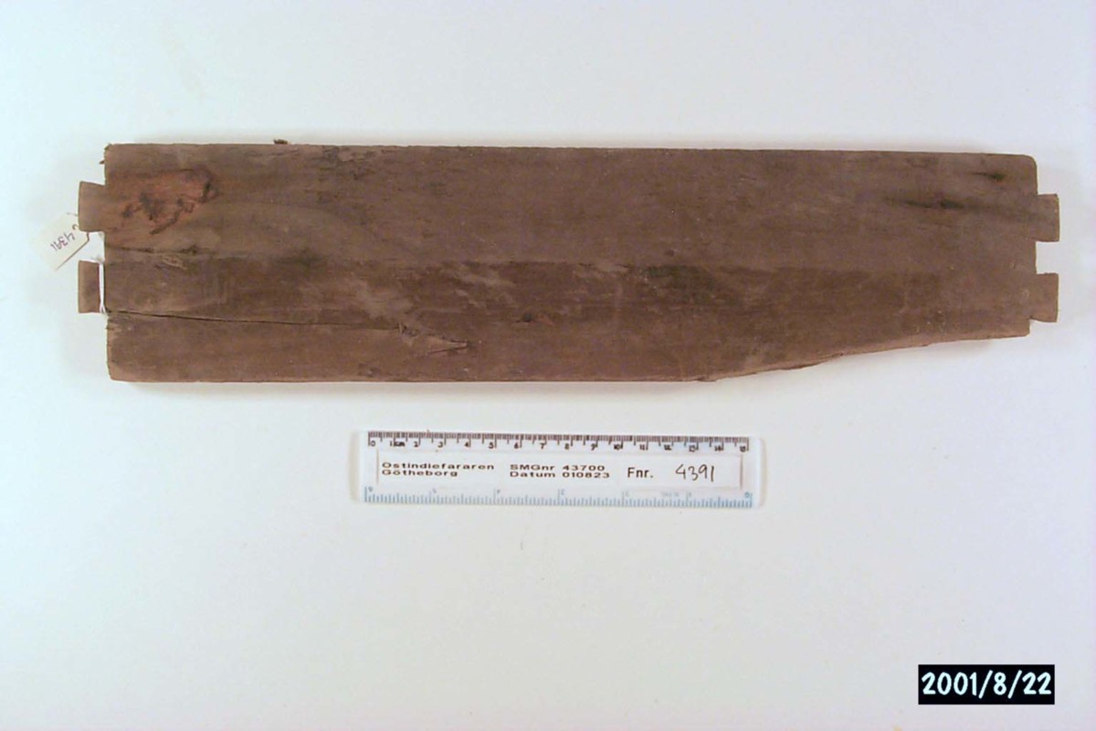 Föremålet är från vraket av ostindiefararen Götheborg, som gjorde tre resor till Kina 1739-45. Vid hemkomsten från den sista resan 12 september 1745 förliste fartyget vid grundet Hunnebådan strax utanför Nya Elfsborgs fästning. Vid flera tillfällen har material tagits upp från vraket. Föremålet kommer från de marinarkeologiska utgrävningarna på platsen 1986-1992.