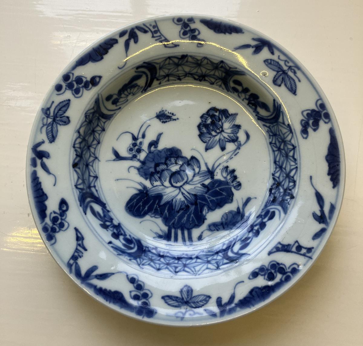 Underglasyrblå dekor; motiv: Mittmotivet lotusblommor, i kälningen en stjärnbård med blomreserver och runt brättet vindruvor och bambu. Kvistrankor på brättets baksida. Naggad i kanten undertill