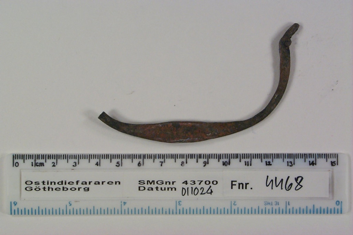 2) Bygel, avbruten från 1). L: ca 100 mm, b: ca 50 mm, t: 4 mm, förtjockning till 10 mm på mitten, där förekommer ornament i form av blad. Avbruten i ena änden, avslutad med vinkel och bladornament. Saknar eget fyndnummer, kan inte finna reg. Blankett.