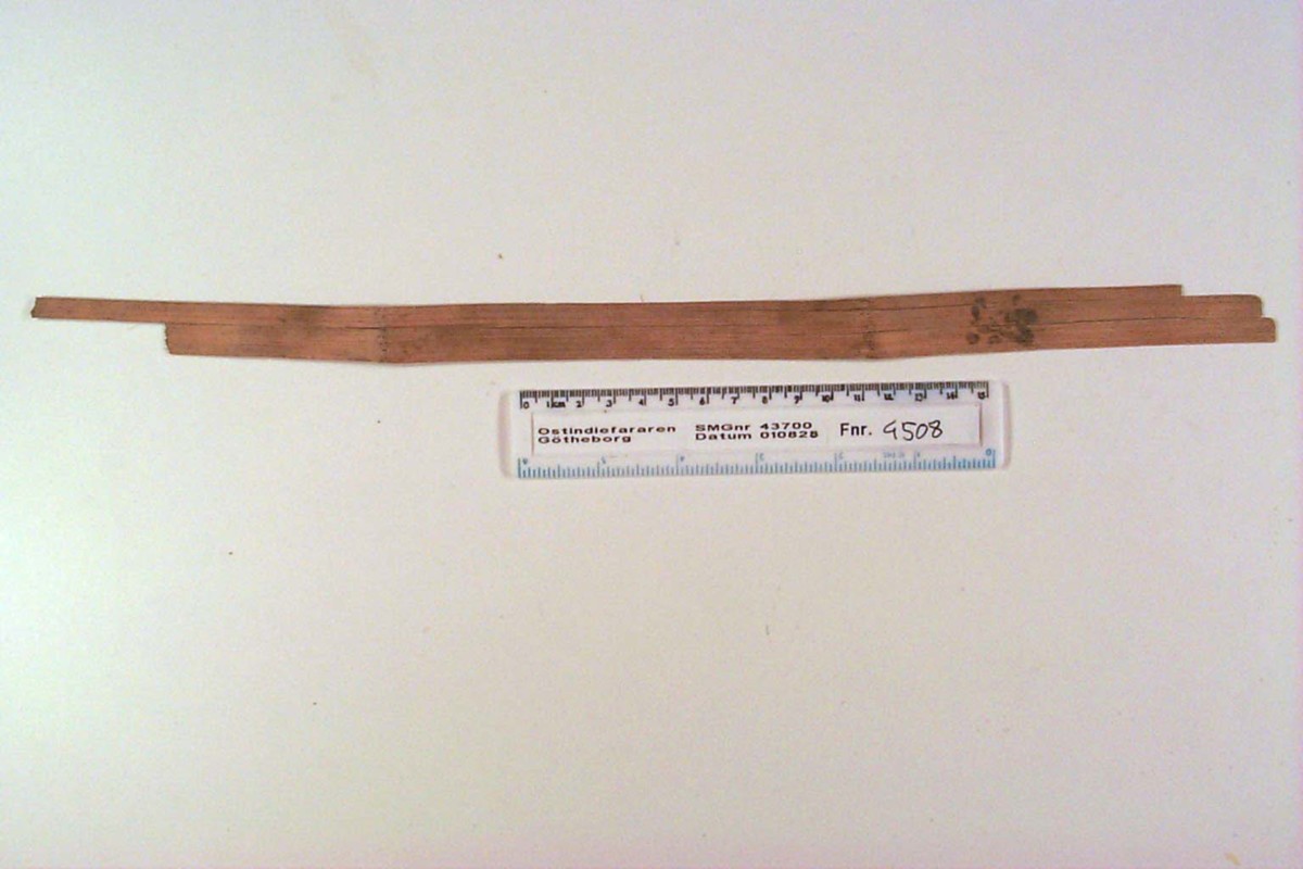 Föremålet är från vraket av ostindiefararen Götheborg, som gjorde tre resor till Kina 1739-45. Vid hemkomsten från den sista resan 12 september 1745 förliste fartyget vid grundet Hunnebådan strax utanför Nya Elfsborgs fästning. Vid flera tillfällen har material tagits upp från vraket. Föremålet kommer från de marinarkeologiska utgrävningarna på platsen 1986-1992.