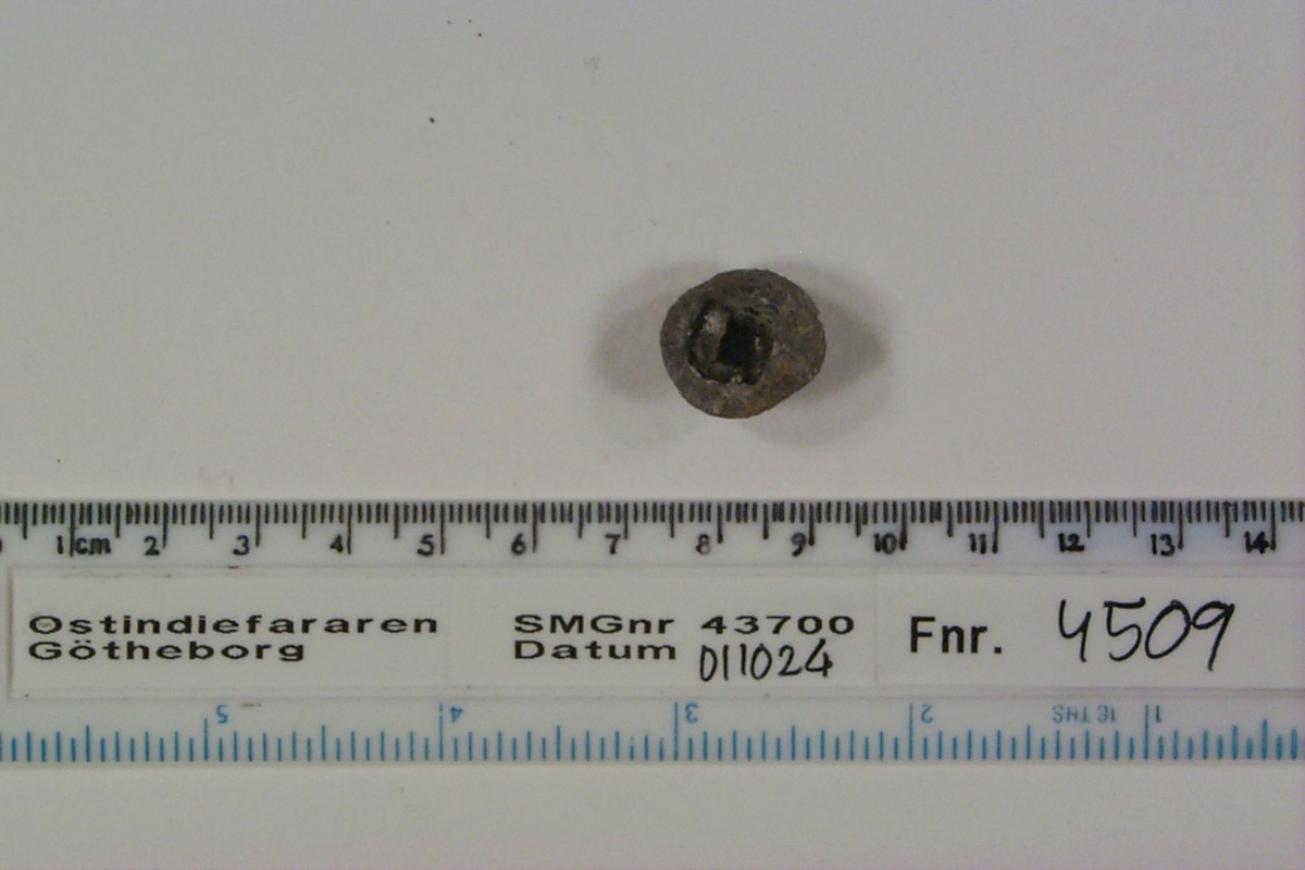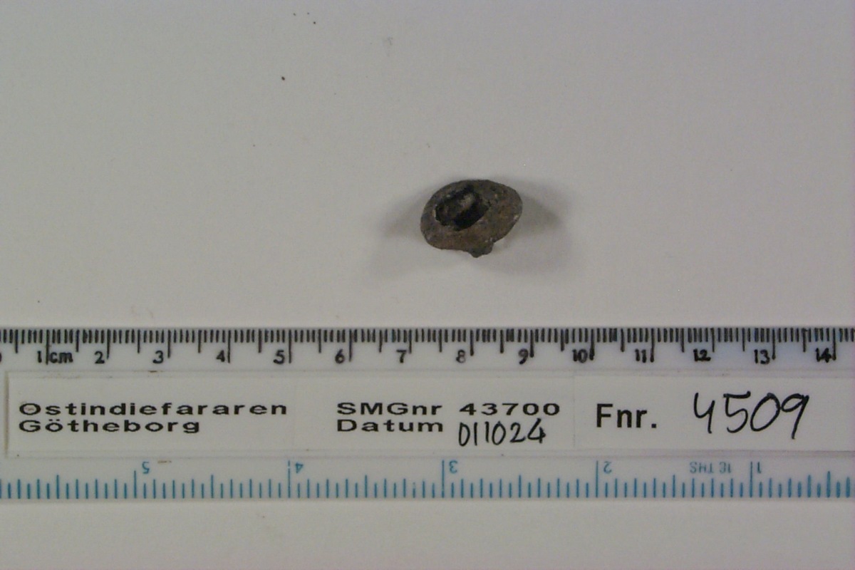 Föremålet är från vraket av ostindiefararen Götheborg, som gjorde tre resor till Kina 1739-45. Vid hemkomsten från den sista resan 12 september 1745 förliste fartyget vid grundet Hunnebådan strax utanför Nya Elfsborgs fästning. Vid flera tillfällen har material tagits upp från vraket. Föremålet kommer från de marinarkeologiska utgrävningarna på platsen 1986-1992.