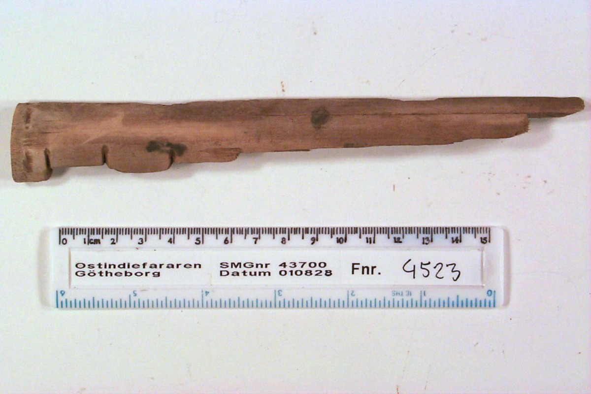Föremålet är från vraket av ostindiefararen Götheborg, som gjorde tre resor till Kina 1739-45. Vid hemkomsten från den sista resan 12 september 1745 förliste fartyget vid grundet Hunnebådan strax utanför Nya Elfsborgs fästning. Vid flera tillfällen har material tagits upp från vraket. Föremålet kommer från de marinarkeologiska utgrävningarna på platsen 1986-1992.