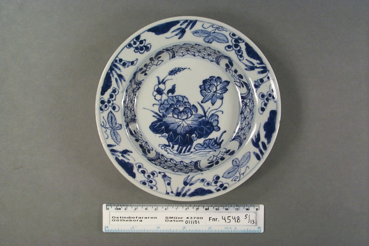 Underglasyrblå dekor; motiv: Mittmotivet lotusblommor, i kälningen en stjärnbård med blomreserver och runt brättet vindruvor och bambu. Kvistrankor på brättets baksida.
