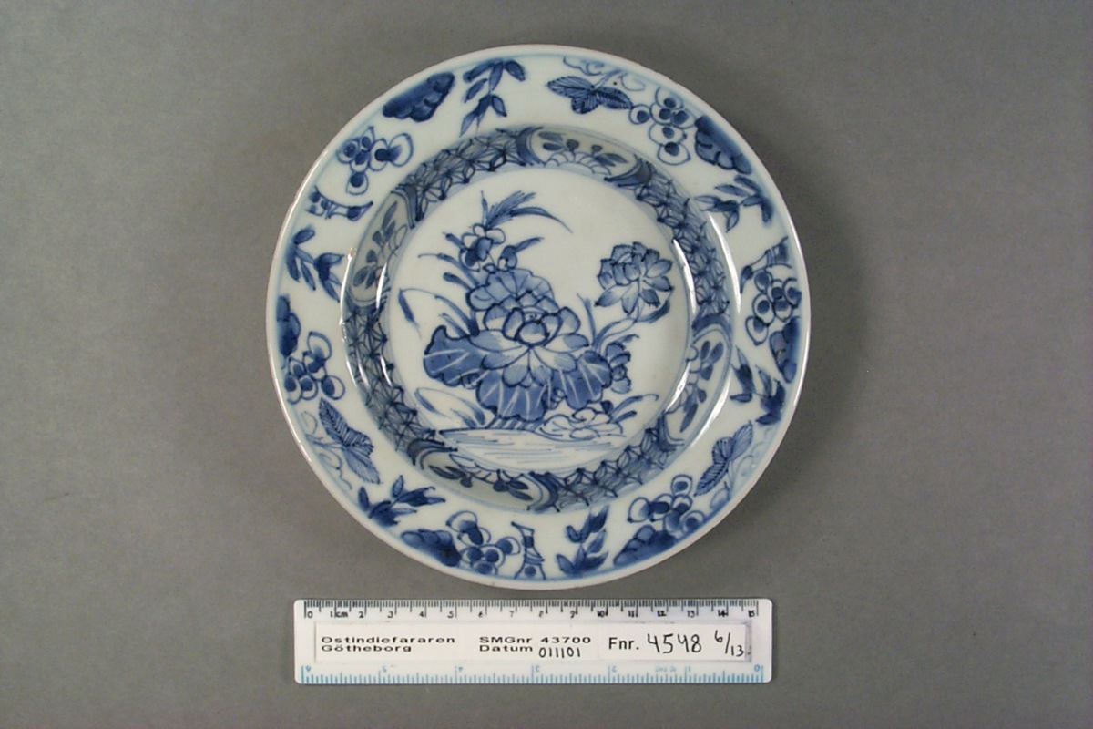 Underglasyrblå dekor; motiv: Mittmotivet lotusblommor, i kälningen en stjärnbård med blomreserver och runt brättet vindruvor och bambu. Kvistrankor på brättets baksida.