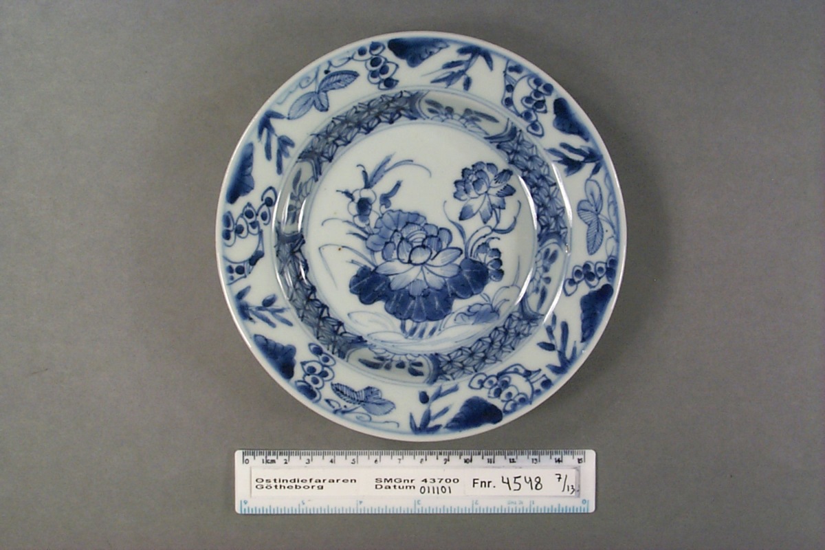 Underglasyrblå dekor; motiv: Mittmotivet lotusblommor, i kälningen en stjärnbård med blomreserver och runt brättet vindruvor och bambu. Kvistrankor på brättets baksida.