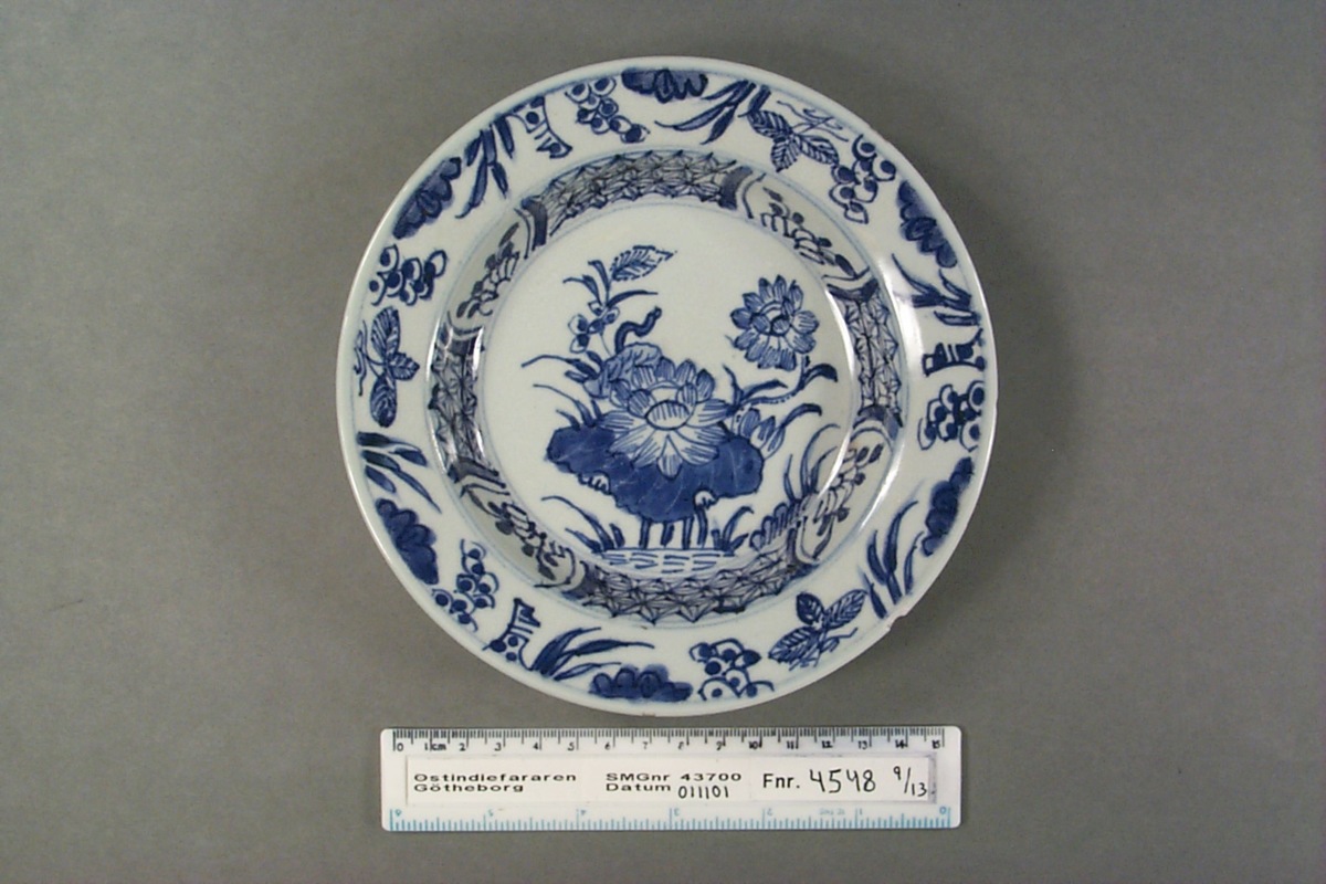 Underglasyrblå dekor; motiv: Mittmotivet lotusblommor, i kälningen en stjärnbård med blomreserver och runt brättet vindruvor och bambu. Kvistrankor på brättets baksida.