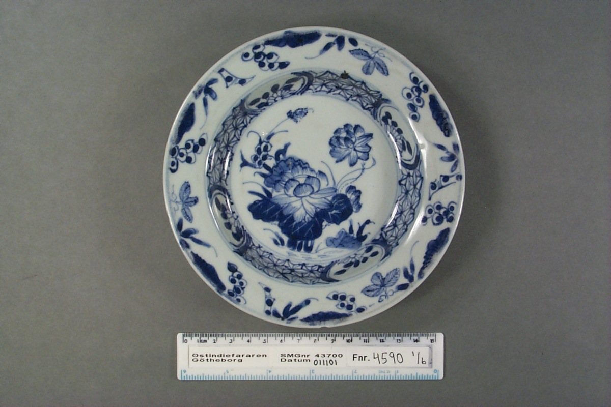 Kategori A; Underglasyrblå dekor; motiv: Mittmotivet lotusblommor, i kälningen en stjärnbård med blomreserver och runt brättet vindruvor och bambu. Kvistrankor på brättets baksida.