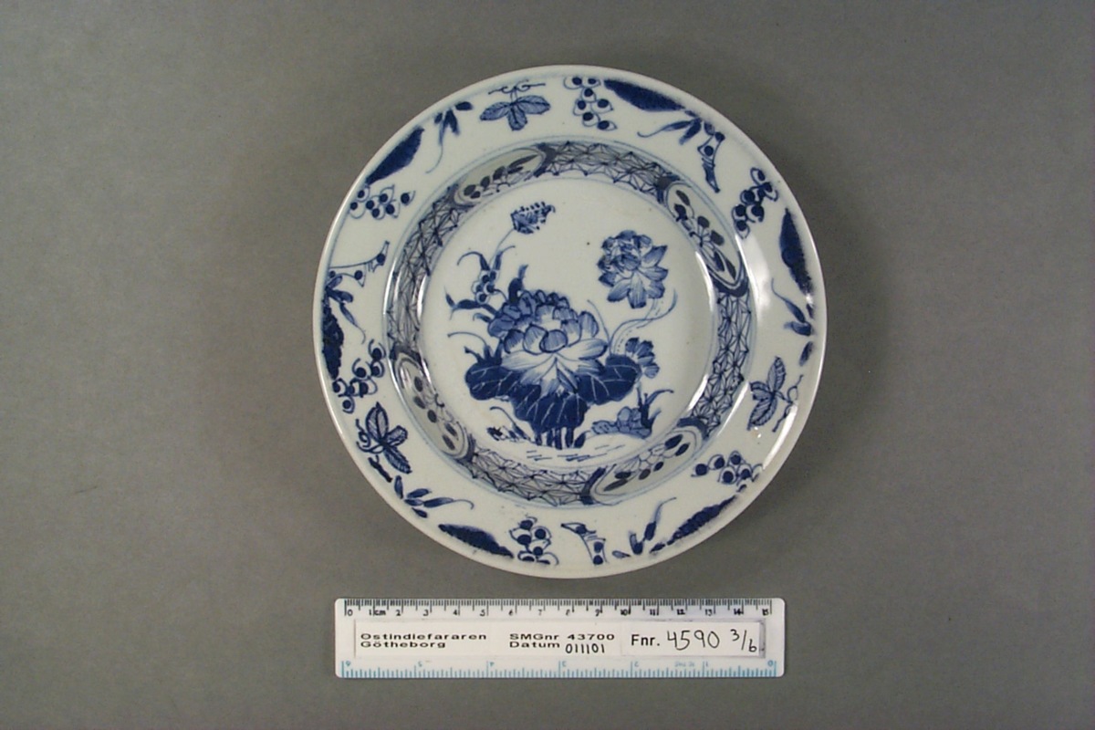 Kategori A; Underglasyrblå dekor; motiv: Mittmotivet lotusblommor, i kälningen en stjärnbård med blomreserver och runt brättet vindruvor och bambu. Kvistrankor på brättets baksida.