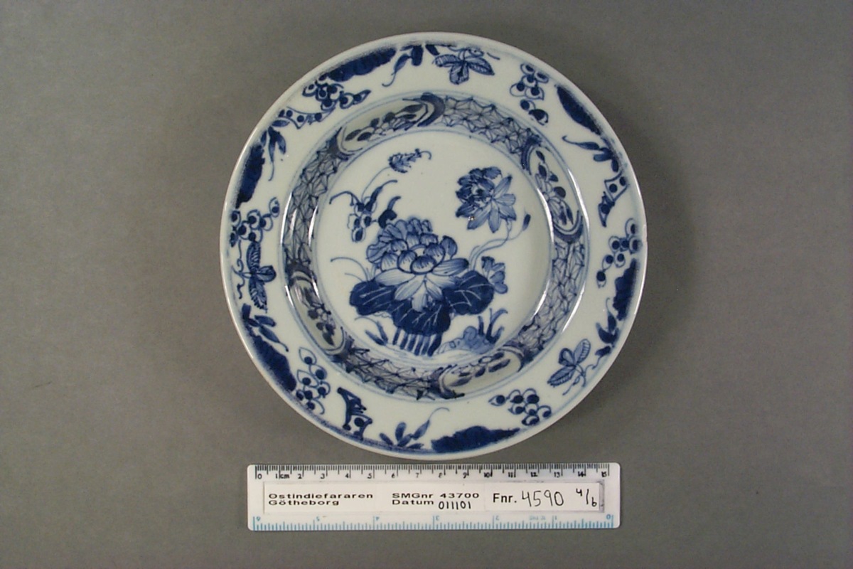 Kategori A; Underglasyrblå dekor; motiv: Mittmotivet lotusblommor, i kälningen en stjärnbård med blomreserver och runt brättet vindruvor och bambu. Kvistrankor på brättets baksida.