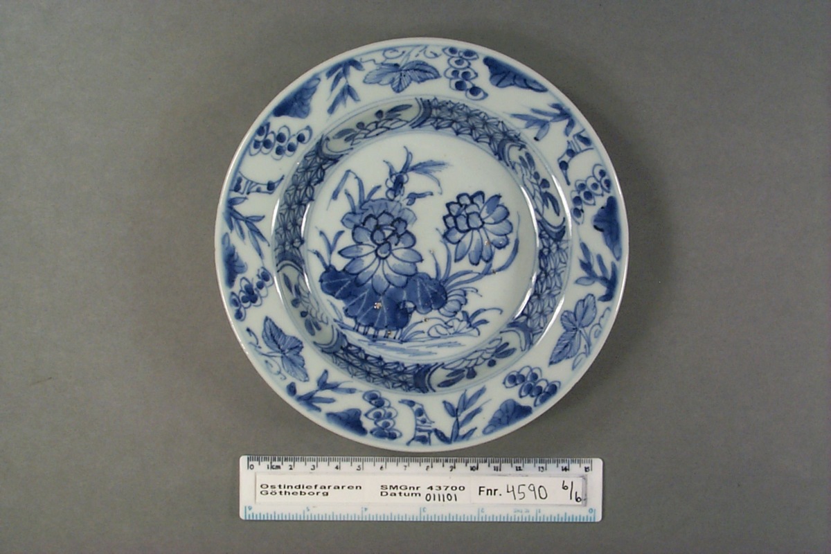 Kategori A; Underglasyrblå dekor; motiv: Mittmotivet lotusblommor, i kälningen en stjärnbård med blomreserver och runt brättet vindruvor och bambu. Kvistrankor på brättets baksida.